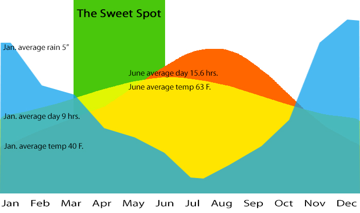 Without a covered bed you’re missing out on some of the best growing conditions of the year. Check out the chart below – from March to June the days get longer and daytime temperature warms but nights are still cold and the soil in your garden is too wet to work. A cold frame allows you to take advantage of this time to grow abundant, beautiful veggies with less work, little cost and under ideal conditions.